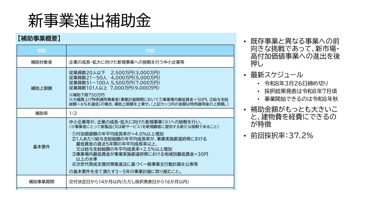 既存事業とは異なる分野への進出や、新市場・高付加価値事業への挑戦を支援する補助金です。