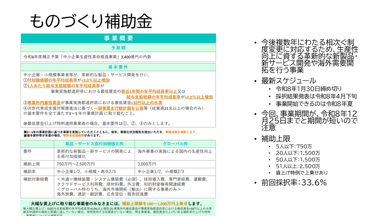 一方で、補助下限額が設定されており、一定以上の投資規模が前提となります。また、建物費を含めた場合、採択後の交付申請に時間がかかり、実際の事業開始が遅れやすい点には注意が必要です。